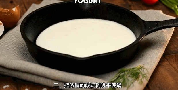 一个里黄外白的标准太阳蛋:平底锅加酸奶,中间再把罐头黄桃一放就完事。