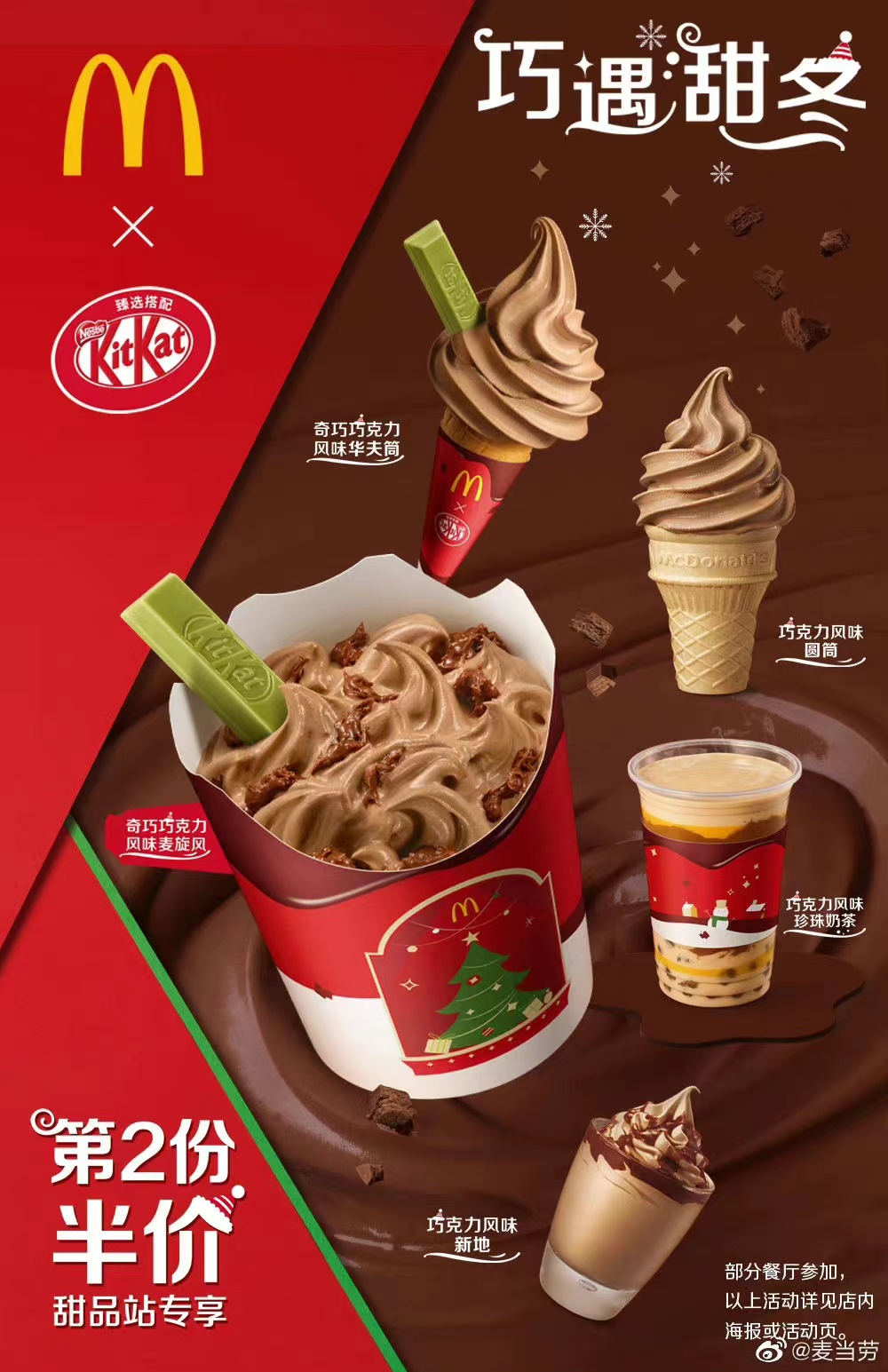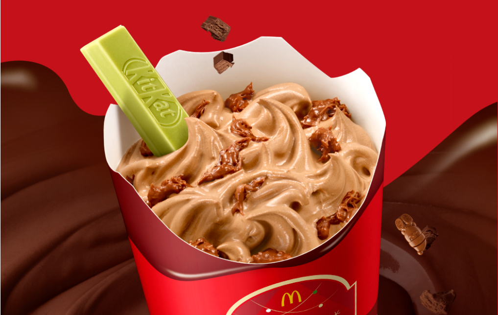 原来麦当劳蹭圣诞节,跟雀巢旗下的KitKat奇巧出了联名圣代,分别有奇巧风味麦旋风和奇巧巧克力风味麦旋风:给你在雪糕里加KitKat威化可可酱,然后插一根抹茶味巧克力。