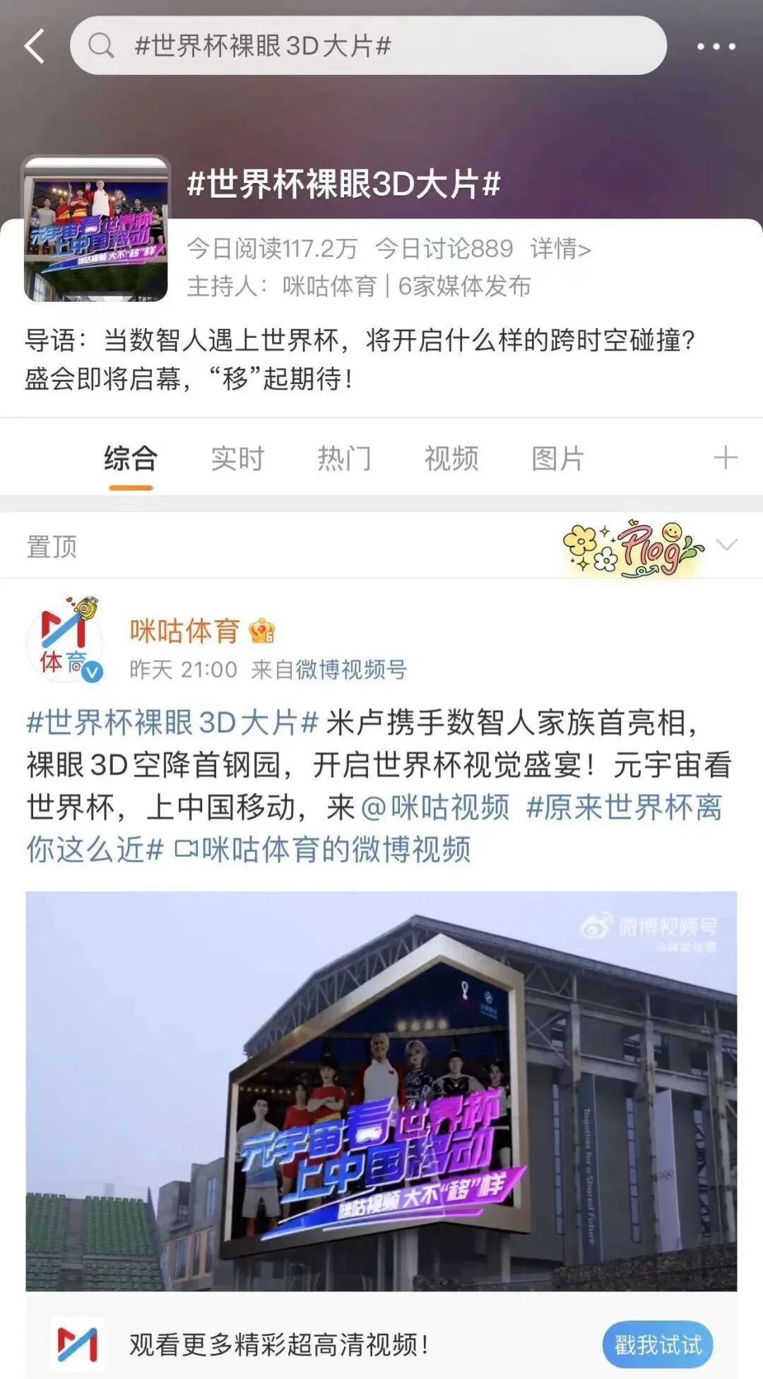 值得一提的是,在此次活动中,中国移动也在线上发布了相关话题#世界杯裸眼3D大片#与网友一起互动,从而更加将他们带入到品牌营造的氛围中。可以说,中国移动此次发布的这支世界杯元宇宙裸眼大片,确实在世界杯带来之际快速营造出了“又一全球体育盛事即将到来”的热烈氛围感,也是品牌深耕体育领域的重要一环。