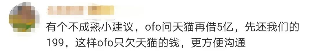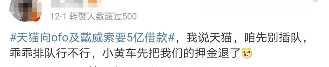 根据法院公告,天猫要求被告ofo运营主体东峡大通立即支付借款本金及相应利息共计5.38 亿余元,被告戴威承担连带清偿责任。天猫讨债5个亿消息一出,一千多万ofo用户坐不住了。不还钱事小,被“诈骗”事大!甚至还有用户想出来以拳头还债的泄愤高招。众所周知,2018年ofo出现了资金链危机,也就是这个时候ofo急着抵押资产周转资金。企业信用信息公示系统显示,ofo以未确定具体数量的共享自行车作为抵押物,从天猫手里拿得了12.66亿元债权。另一个大家最关心的问题,天猫是不是“插队”追债了?依据偿还规则,优先债权>普通债权,天猫作为抵押权人具有优先性。ofo欠债5亿,即便按照最高押金199元换算,排名还得再增加251万人!更何况,去年北京法院海淀区人民法院调查发现,ofo已经没有可供执行的财产,还债遥遥无期。看来有生之年想要收到ofo的押金,是难于上青天了。被天猫唤醒记忆的网友发现,ofo已经不支持查看押金了。