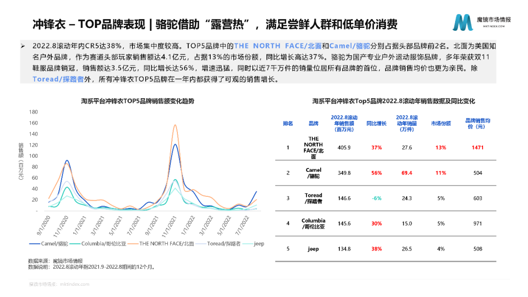 冲锋衣裤的近一个滚动年内CR5达38%,市场集中度较高。TOP5品牌中的THE NORTH FACE/北面和Camel/骆驼分别占据头部品牌前2名。