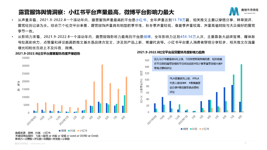 从社交声量来看,2021年9月至2022年8月内,露营服饰声量最高的平台是小红书,全年声量达到13.78万篇,相关推文主要以穿搭分享、种草测评、露营经历记录为主。