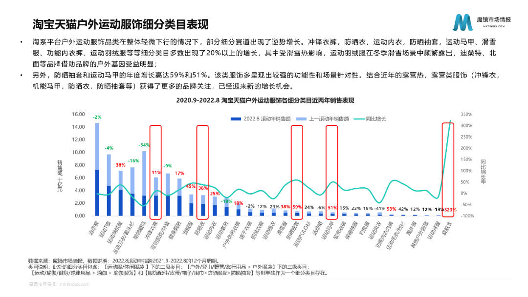 户外运动服饰品类在整体轻微下行的情况下,部分细分赛道出现了逆势增长。冲锋衣裤,防晒衣,运动内衣,防晒袖套,运动马甲、滑雪服、功能内衣裤、运动羽绒服等等细分类目多数出现了20%以上的增长,其中受滑雪热影响,运动羽绒服在冬季滑雪场景中频繁露出,迪桑特、北面等品牌借助品牌的户外基因受益明显。