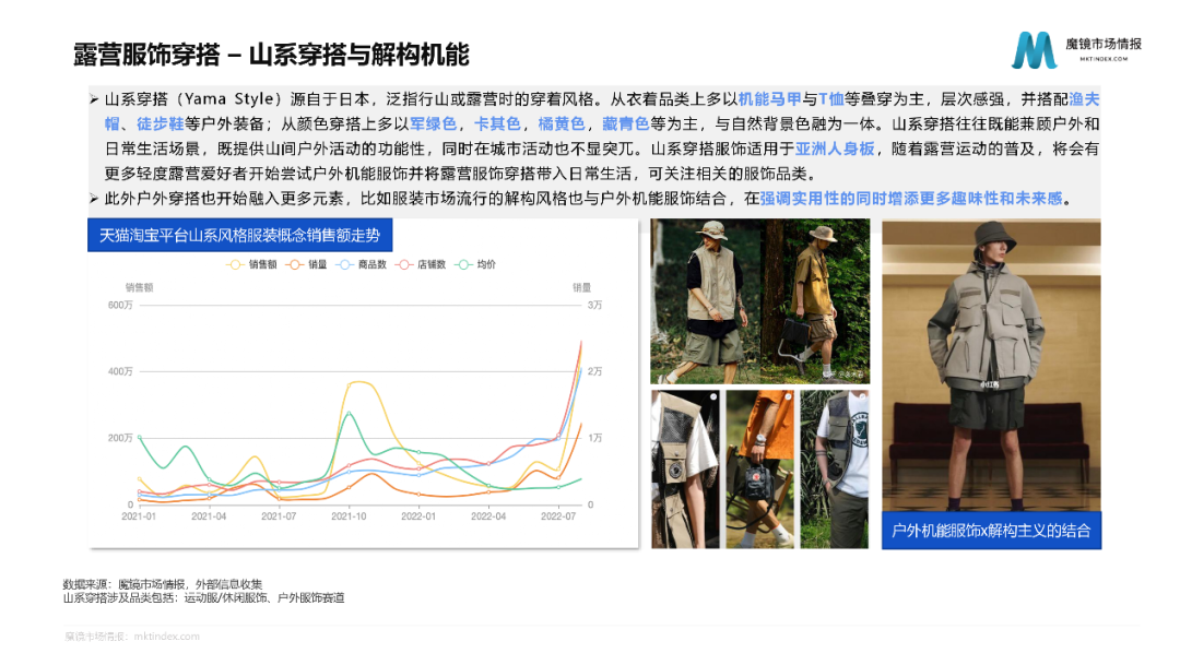山系穿搭往往既能兼顾户外和日常生活场景,既提供山间户外活动的功能性,同时在城市活动也不显突兀。山系穿搭服饰适用于亚洲人身板,随着露营运动的普及,将会有更多轻度露营爱好者开始尝试户外机能服饰并将露营服饰穿搭带入日常生活,可关注相关的服饰品类。