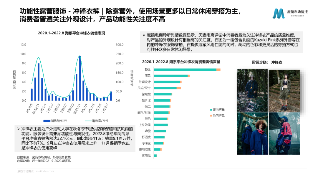 魔镜电商聆听舆情数据显示,天猫电商评论中消费者最为关注冲锋衣产品的质量维度,同时对产品的外观设计有相当高的关注度。如下图,包含北面的Kazuki Pink系列外套等在内的冲锋衣服饰穿搭,在提供遮蔽风雨性能的同时,跳动的色彩和更灵活的穿搭方式也可胜任众多日常休闲场景。