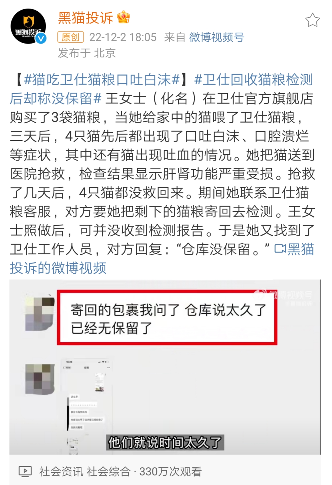 近日,根据养猫人士王女士(化名)投诉,她从卫仕官方旗舰店买了3袋猫粮,回家给4只猫吃后,均出现口吐白沫等情况,其中有只猫直接吐血了。她将猫送到医院抢救,检查结果显示肝脏功能严重受损。抢救了几天后,四只猫都没能救回来。四只爱猫同时丧命,悲愤的王女士找到卫仕旗舰店的客服解决问题。在客服的指导下,她将剩余的猫粮寄回去检测。但更让人气愤的是,猫粮寄回去,就没有了音信,王女士始终没有收到检测报告。等她去催问卫仕工作人员,却被告知“仓库没有保留”。经过多番沟通,卫仕只给她赔付了2104元医药费和700元费用的补贴。不正面解决消费者的问题,试图逃避责任,用钱息事宁人,作为一个会影响猫咪健康甚至生命的猫粮品牌,卫仕的危机公关,简直是错到离谱。而且,我们会发现,无论微博还是小红书,对卫仕猫粮质量问题的投诉并非个例。猫咪眼睛感染、肝损伤、又拉又吐等,“铲屎官”们怨声载道。甚至有的宠物医院对于寄养猫的自带猫粮,都不建议是卫仕。