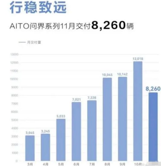 华为的合作伙伴赛力斯近期表现优异,据其12月1日发布的公告数据显示,11月赛力斯汽车产量为8646辆,销量为8262辆,同比增长335.07%,全年累计销量为69884辆,同比增长721.68%。其中,华为与赛力斯联合打造的AITO问界系列,11月共交付了8260辆。问界系列销量连续三个月突破10000辆后,又骤降回8000辆的销售水平。虽然没能在过去三个月持续破万的基础上稳住脚跟,但这样的成绩已经非常可观。业界人士指出这或由于11月份重庆地区疫情影响所致,AITO赛力斯重庆工厂在疫情中受到了较大的影响。