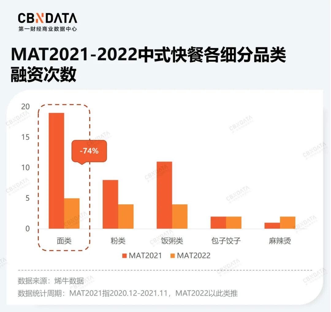 与此同时,高估值的提前透支,也让资本不再买单。去年频繁融资的网红面馆今年普遍“哑火”,行业内最新的融资消息停留在新一轮疫情前的1月底。根据烯牛数据,MAT2022周期内,中式快餐是所有餐饮品类中融资次数下滑最明显的品类。而中式快餐赛道中,又以面馆的资本次数下滑最明显,融资次数对比MAT2021年同期大跌74%。