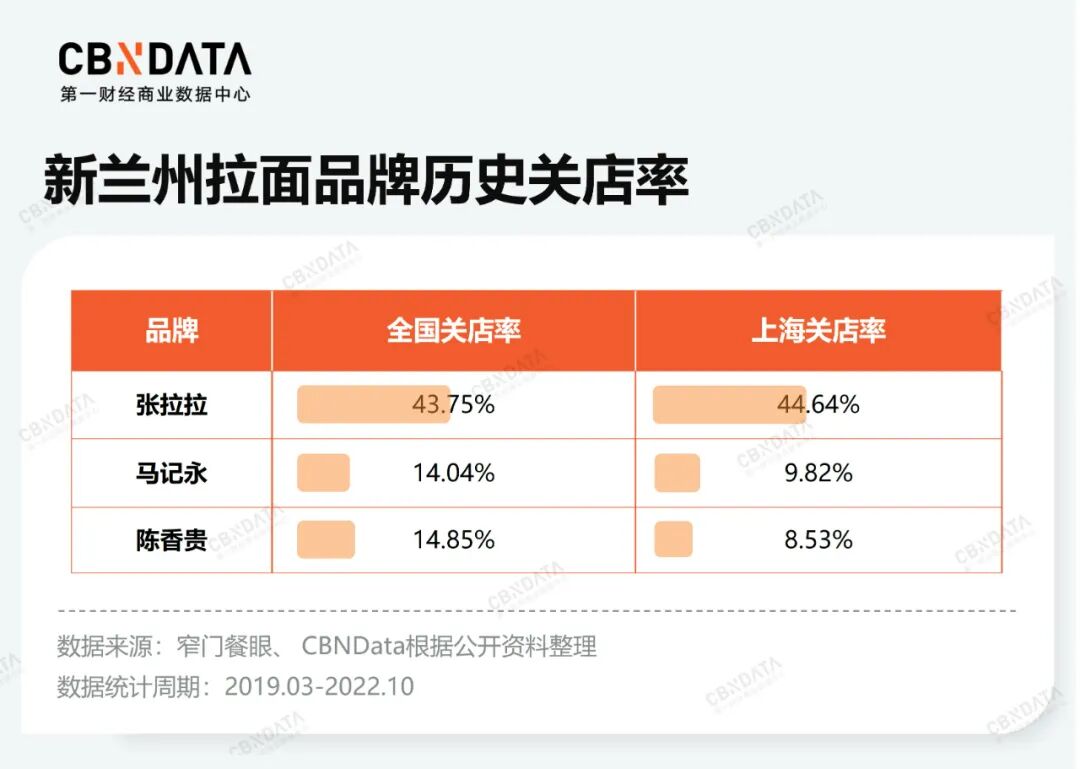 不同新中式面馆在疫情下的表现也有所不同,就兰州拉面品牌来说,对比马记永、陈香贵,张拉拉不管是门店规模还是经营情况都有些掉队。过去一年,张拉拉的门店规模不升反降,关店率也远高于马记永和陈香贵。根据窄门餐眼,自2019年3月张拉拉首店开业以来,其所有门店的关店率高达43.75%,近乎是马记永和陈香贵的三倍。在门店重镇上海,张拉拉的关店率甚至高于全国整体水平,达到44.64%。这或许也是张拉拉今年急于开放加盟,减小经营风险和经营压力的原因。