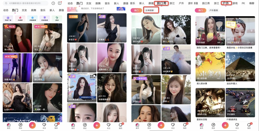 记者在体验“花椒直播”后发现,如今花椒首页有多个栏目给到了“社交”业务,比如“附近”“同城”“交友”等。但花房集团仅0.58亿的月活,使得附近的人数量十分有限,活跃度也不足。至于对脱口秀、户外在内的多元化直播类型的尝试,我们发现不仅内容供给不足,直播间数量很少,而且往往货不对板。脱口秀直播间里几乎没有脱口秀表演,所谓的户外直播间,场景有不少是在室内。与此同时,这些聊胜于无的尝试,也一概没能脱离秀场的本质。