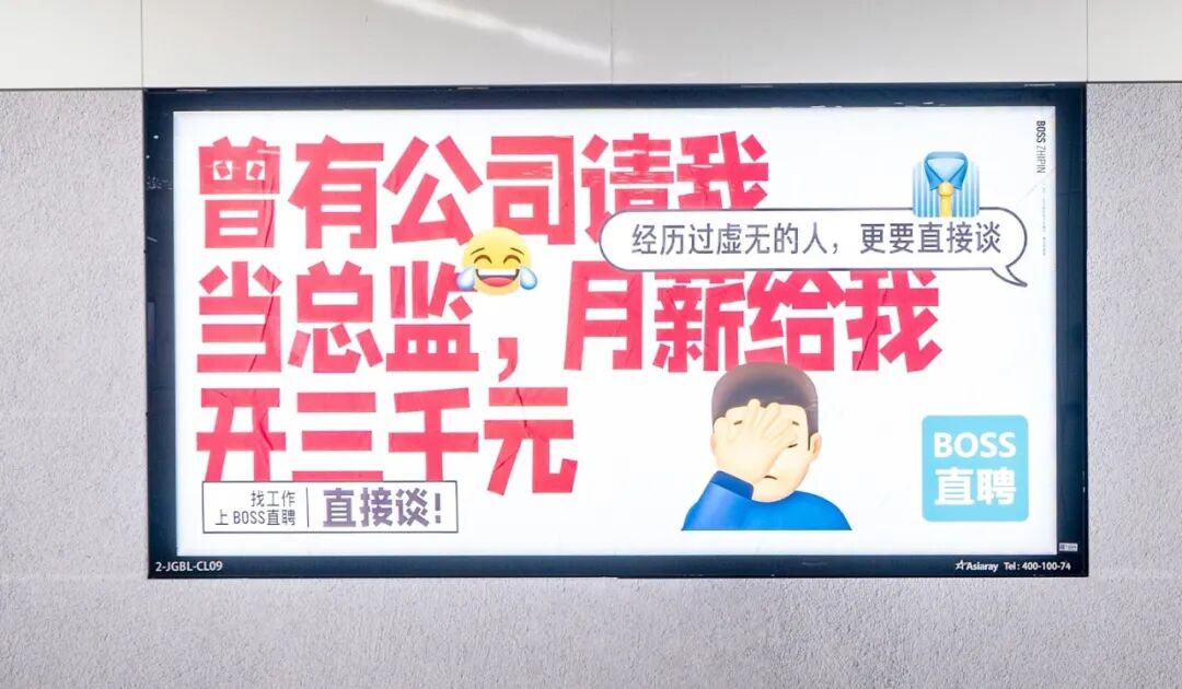 与之前的洗脑广告相比,这一次BOSS直聘更富有「人情味」和「生活气」,它选择了更柔软的沟通方式,不直接谈找工作,而是将关注重点放在了各行各业背后千千万万个工作人员身上。消费者往往只关注产品的口味和包装,而很少关注背后的生产链和工作者,Boss直聘这组文案「由表及里」,引导人关注每一个产品或行业背后所连接着的千千万万个工作岗位。除了快消品,还有建筑、餐饮、火力发电、通信、电器、交通、服饰等行业,从研发端到销售端,再到使用端,无论是哪个行业,哪怕是最基础的工作,也是由千万工作者的高阶智慧编织而来。人类社会之所以能维系高速运转,是因为有各行各业的人在努力工作。每份看似不起眼的工作,都凝聚了整个行业和产业链千千万万人的心血。“人的本质是其一切社会关系的总和。社会是由无数个人组成一定社会关系构成的有机整体,社会发展离不开人的作用。”因此BOSS直聘以「事在,人为」为传播主题,事在人为原本的意思,是指在一定的条件下,事情能否做成要看人的主观努力如何。而BOSS直聘将这个成语拆分开,做了全新解读,正因为有事做,所以才有了更多为之付出的人,也有事情靠人完成的意思。有人评价为这组文案是“螺丝钉的价值白皮书”,它强调个体的重要性,反映出每个职位工作者的价值感和使命感。BOSS直聘还将这组广告搬到线下地铁和公交站,在北京、上海、广州、深圳、杭州等一线城市,选择了拆迁风的形式,水泥质感背景配上醒目的文案,强势吸睛。在最规整的地方做牛皮癣风格广告,制造反差效果,Boss直聘这波广告引爆线下声量。02