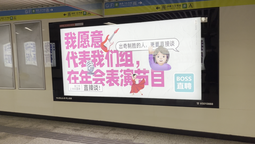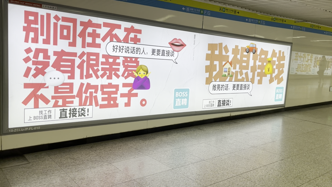 凭借“直聊”模式,BOSS直聘曾创下上线一年用户规模便突破100万的漂亮数据,“找工作跟老板谈”的洗脑广告语更是深入人心。但与此同时,直白的口号不仅令人反感,也很难再影响受众心智,品牌需要讲出新故事,和年轻人进行深度沟通。今年三四月招聘季,BOSS直聘启用新slogan,将原来的「找工作,我要跟老板谈」换成「找工作,上BOSS直聘直接谈」,弱化了老板的存在,强化了平台的价值。不仅如此,BOSS招聘还在北京、长沙等多地地铁站投放了一组引人注目的海报文案,道出广大求职者的真实心声。这组海报以应届毕业生、宝妈、资深职场人士、00后的身份口吻,从个人兴趣和意愿出发,阐述他们对找工作的态度。打破了招聘方占据主导地位的传统认知,将面试的主动权交给求职者,契合招聘是双向选择的主流就业趋势。更在北京西二旗、上海人民广场、深圳前海湾、杭州凤起路等5座城市地铁站做了一场特别的展览。主题叫「我,工作,生活——我是工作的主语」。