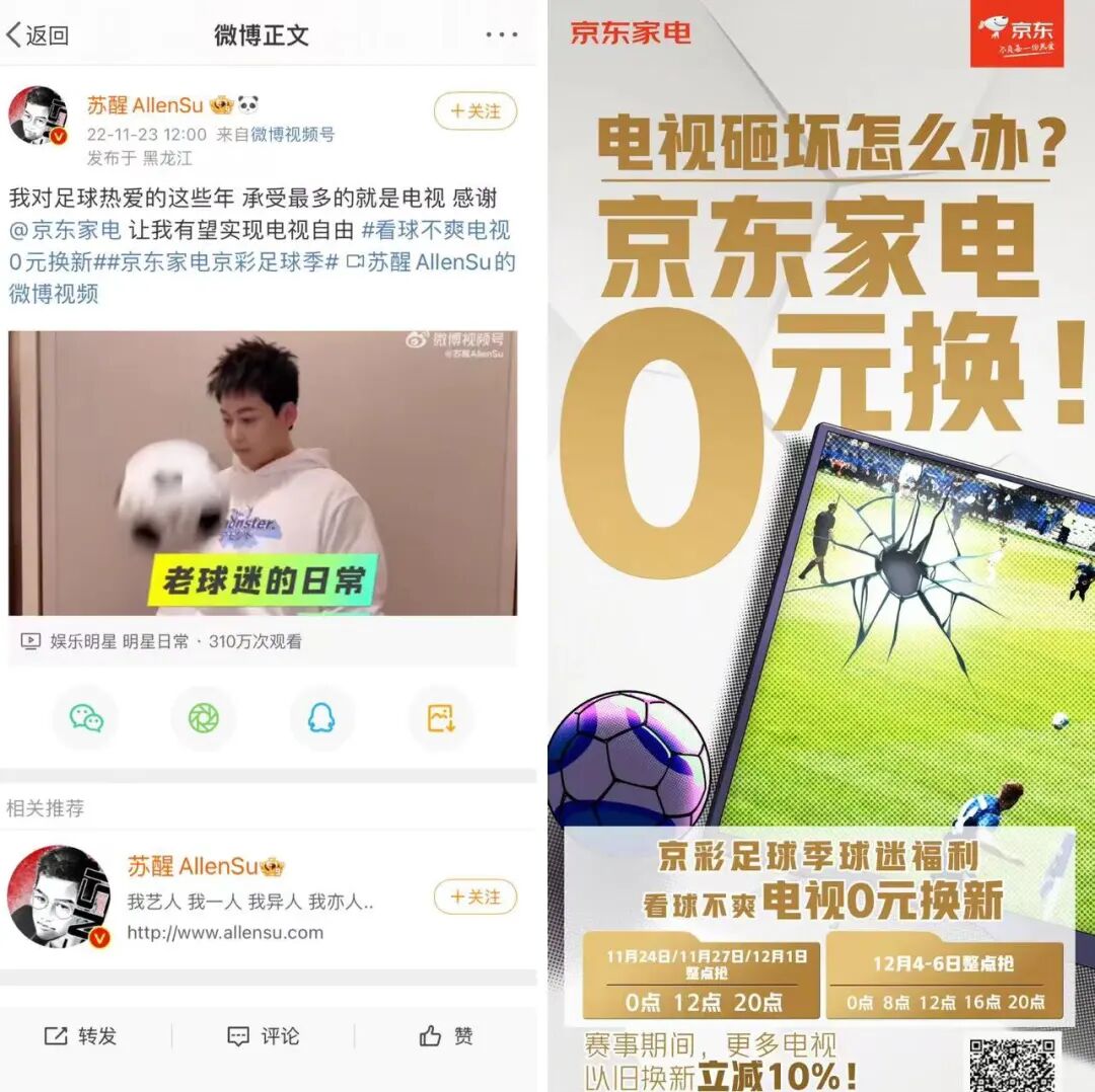 某种意义上来说,足球比赛不仅是一场体育赛事,也是球迷们的一场情绪社交,广大足球爱好者的情感和情绪会在世界杯期间被一定程度地放大。2019年的欧冠半决赛,歌手苏醒就曾在一气之下砸坏了自己家的电视机,相关的视频至今仍在被传播和探讨。今年,京东家电抓住了砸电视的热点,与苏醒来了一场巧妙联动。