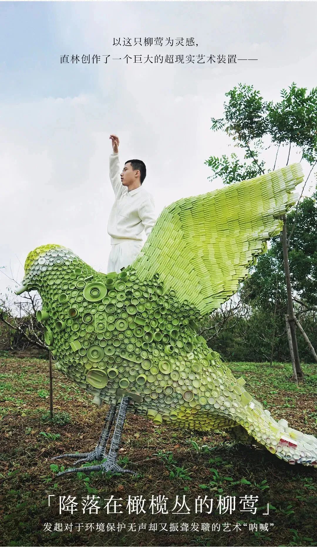 为了“复活” 甘肃柳莺,一叶子和直林从海边和丛林中捡来4000件的废弃塑料、并回收了2000个一叶子次抛精华包装,最终创作出了这只高2米、宽1.5米的超现实艺术装置——“降落在橄榄丛的柳莺”,使废弃物重新拥有了生命力。当甘肃柳莺不再翱翔于蓝天,而是静静地伫立在一片橄榄林,没有了婉转的鸣叫。而是通过震撼的塑料垃圾堆叠这种暴力的方式,让人们从视觉上被画面震撼,从而聆听作品背后的环保表达。正如直林所说,艺术其实并不能拯救什么,但是它可以帮助我们看到。而这正是一叶子想要做的,用艺术的手段为人们带来环保的反思,显然这只“降落在橄榄丛的柳莺”对一叶子品牌环保理念的演绎、环保价值的彰显,找到了一个极具心灵震撼的表达方式。02