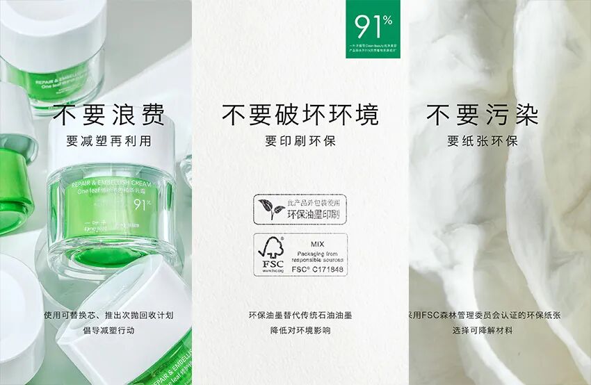 今年10月,一叶子联手中国国家地理打造的《什么是中国成分》纪录片正式上线。该纪录片首次正式向外界全方位展示了甘肃陇南油橄榄——这一独特的中国成分。而这正是一叶子为其系列产品选定的独特原料。基于此成分,一叶子推出了修护修色面膜、精华乳霜、次抛精华、精粹水等系列修护修色产品,这成为一叶子迈入纯净美容领域的重要里程碑事件。如果站在这个视角来思考,就会发现一叶子通过“降落在橄榄丛的柳莺”艺术装置为触点为环保发声并非单纯的跟随品牌绿色可持续的风潮,而是有着源自品牌产品价值本身的驱动力。正如艺术家直林所说,“我发现一叶子一直在致力于找到自然界最天然,对肌肤最友好的材料,而其中一种成分就是由甘肃陇南的油橄榄叶中提取出来的,也正是在这片土地上,机缘巧合中,我发现了这种很特别的珍稀鸟类——甘肃柳莺,难寻的身影,零星的资料,我觉得它能够代表世界上因为环境污染在慢慢消失的所有生灵。”某种程度上来说,这不仅让一叶子这一环保行为有了合理的发声理由,更让保护甘肃陇南的自然环境与一叶子品牌组成了“命运共同体”。而这种命运与共的“环保共同体”显然也顺理成章地将环保事业融入了一叶子的品牌肌理。诚然,企业的经营往往会面临多重选择,不同的选择会产生不同的结果,而环保这一理念已然指引着一叶子的每一个经营决策。不仅设立“纯净美容绿色原料研究中心”实现从原料的培植、到提取、到加工等各环节,遵循绿色环保可持续,对地球环境友好。在化妆品包装方面,一叶子早有布局:推出可替换芯产品,以减少塑料使用;包装采用FSC森林管理委员会认证的环保纸张以保护森林;此外,一叶子的纸盒印刷采用环保油墨代替传统的石油油墨,以降低印刷对环境的影响。可以说,一叶子已然为将环保融入产品设计、生产、研发、制造全过程而身体力行。不仅丰富着消费者关于品牌的环保属性的感知,也丰富着品牌价值想象的空间。03