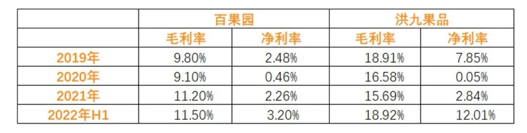 反映在数据上,2019年-2021年,百果园毛利率分别为9.8%、9.1%和11.2%,净利率分别为2.8%、0.5%和2.2%;洪九果品毛利率分别为18.91%、16.58%和15.69%,净利率分别为7.85%、0.05%和2.84%。