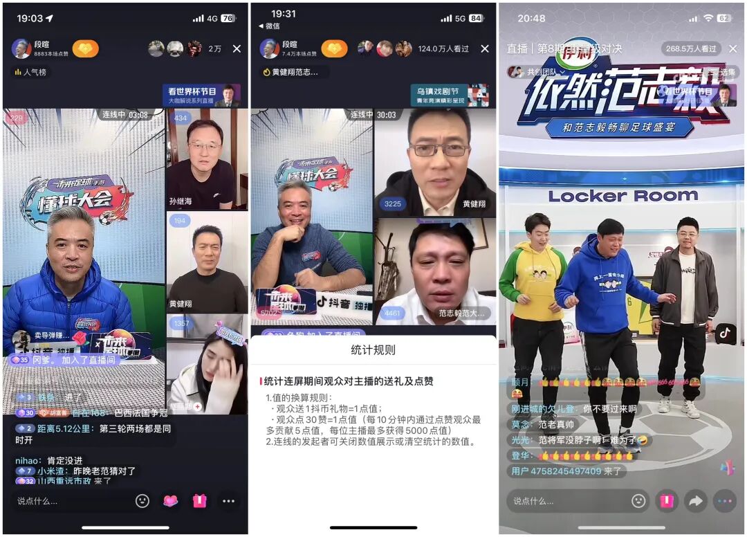 从线上流量的沉淀方式来看,抖音走了相对传统的路线,通过大咖解说+自制节目+足球明星入驻的方式来引导流量。