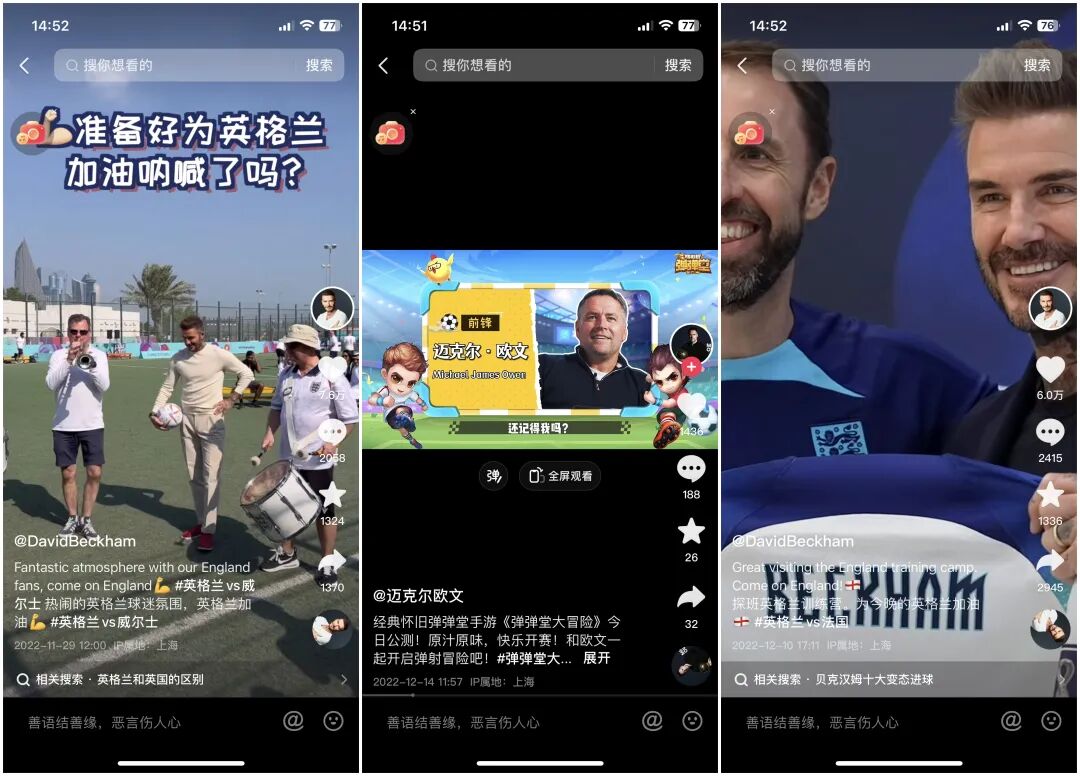 贝克汉姆的短视频内容,几乎全部来自于其他视频剪辑,原创视频极少,更无法谈及平台专属内容。前英格兰国脚迈克尔欧文作为此次抖音世界杯期间最为卖力的体育明星,其短视频更新数量非常之多,但内容却与世界杯关联度非常弱,从带货小游戏,到接龙挑战,来到抖音之后几乎没想要“久留”,账号的打法与用心沉淀粉丝关系不大。另一些足球体育明星,罗纳尔多、内马尔等几乎都在世界杯期间停更。