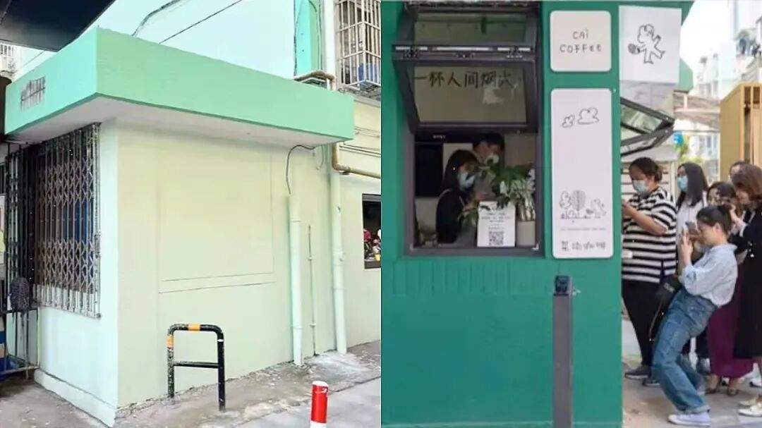 宁波东柳街道上,保安厅被改造成“菜场咖啡”(右)受到青睐 来源:澎湃新闻