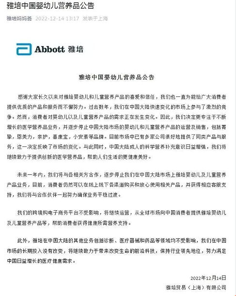 12月14日午后,知名母婴品牌雅培宣布,将逐步停止中国大陆市场的婴幼儿和儿童营养品的运营和销售,仅保留跨境渠道。停止运营和销售,或意味着雅培官宣败走中国。