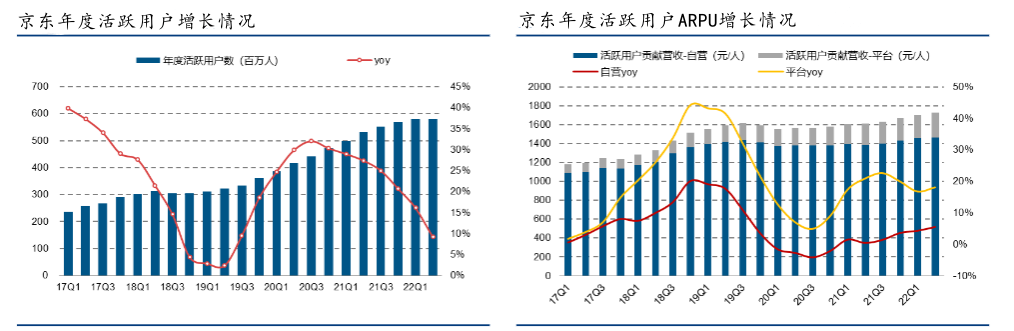 事实上,今年电商平台的冷清在去年时就已有所显露。以京东为例,其在2021年一季度时年度活跃用户以及由年度活跃用户所贡献的自营收入在增速上就已出现明显放缓。而在今年消费市场趋紧的背景下,这种情况也就彻底爆发出来。
