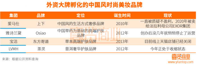 实际上,茶灵并不是唯一一个由大牌孵化的中国风品牌。据壹览商业不完全统计,著名外资大牌爱马仕,雅诗兰黛,宝洁等多个品牌均孵化过中国风子品牌。
