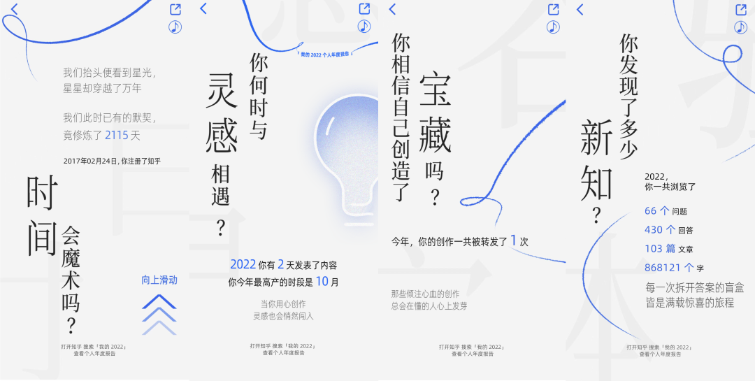 除了线上线下的物料,我们在站内知乎个人数据报告中也沿用了「问答」形式,在用户每一天的使用习惯中,看到一整年的探索轨迹,也回扣了2022的年度主题:「身边自有答案」。