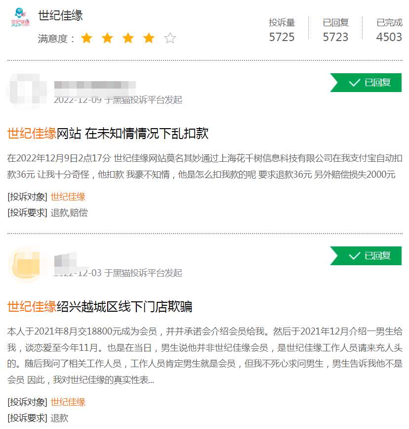 更重要的是在互联网平台上,原本相亲的信任成本就相对较高,如今网上关于婚恋网站的投诉也到处都是。例如在黑猫投诉平台上,关于世纪佳缘的投诉量累积有5700多条。