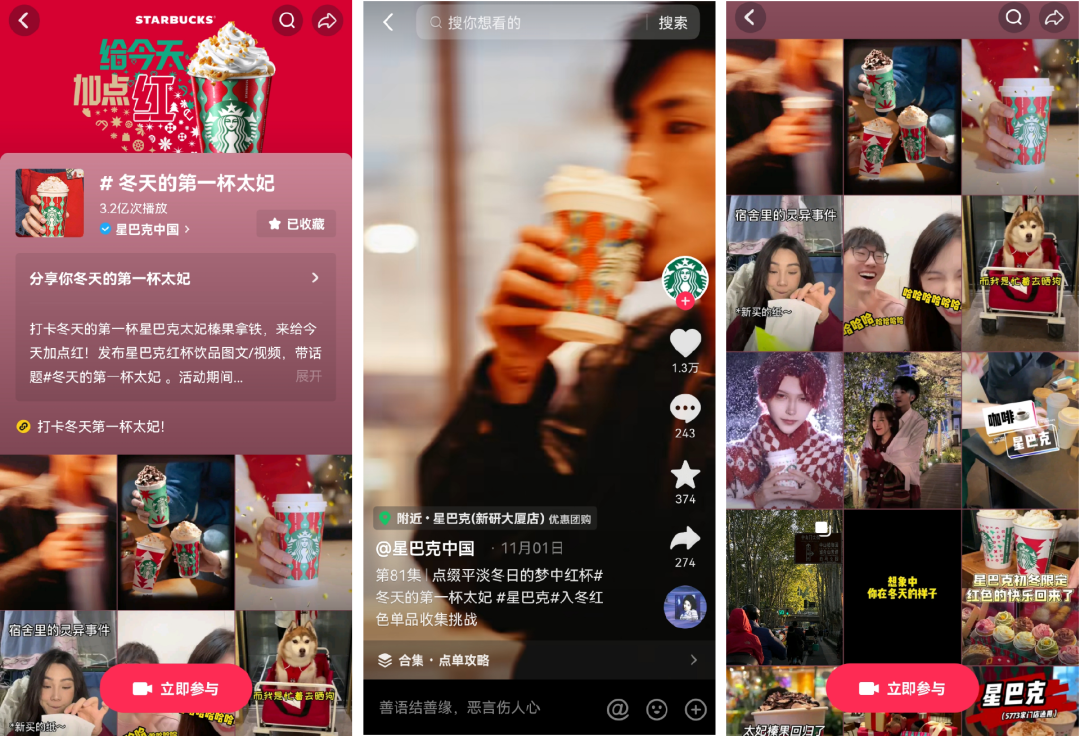 比如,今年冬天星巴克在抖音上线了「分享你冬天的第一杯太妃」活动,通过「限定星杯」吸引用户打卡自己喝到的星巴克太妃拿铁。