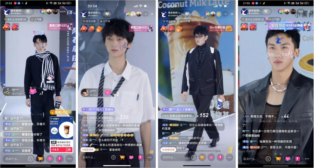 比如前不久,瑞幸就凭借着直播间的「男模天团」火了一把,不同于一般直播间的模式,瑞幸直接在直播间搭了个 T台 ,一时间,不同风格类型的男模拿着不同口味的咖啡迎面走来……
