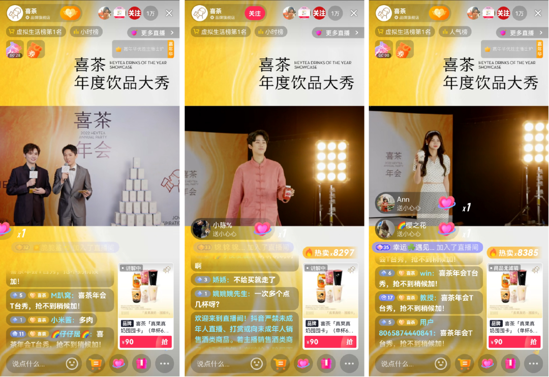 再比如,最近年关将至,喜茶在抖音举办了年度饮品大秀直播,不同的模特代表着不同的饮品进行走秀,身着粉色唐装的男生模特代表的是多肉逃离,身着白色波点裙的女生模特代表的是烤黑糖波波牛乳……