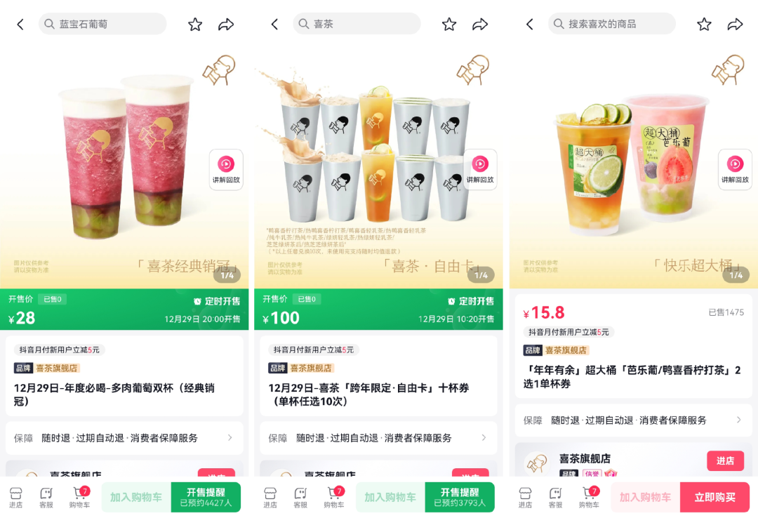 同样大搞价格战的还有喜茶,喜茶的抖音旗舰店显示,现在在抖音上下单两杯经典销冠——多肉葡萄只要 28 块,平均一杯只要 14 块。