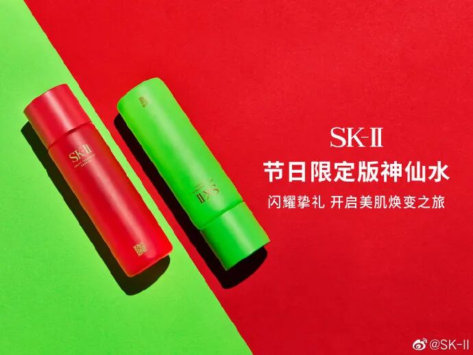 作为SK-II主打的王牌产品,SK-II一直围绕神仙水做瓶身营销。自2008年开始,SK-II每年都会推出限量版的神仙水,为消费者带来全新体验。前段时间,SK-II“神仙水”发布新包装,采用了高饱和的“红配绿”设计,亮瞎眼!还采用了盲盒玩法,隐藏款是黑色包装的SK-II“神仙水”。不过讲真,这个配色,多少有点接受无能。