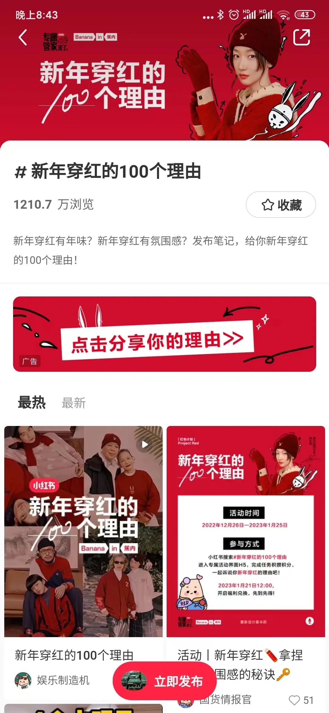 在春节期间,蕉内还深入洞察到消费者的社交分享心理,在小红书平台发起#新年穿红的100个理由#的相关话题,以social话题的方式鼓励大众讲述自己新年穿红的故事与理由,释放内心对2023兔年的期盼。