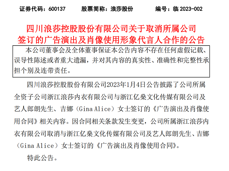 1月4日晚间,浪莎股份的一条披露公告,让无数吃瓜网友对浪莎取消签约郎朗、吉娜为其品牌代言人的“内幕”浮想联翩。
