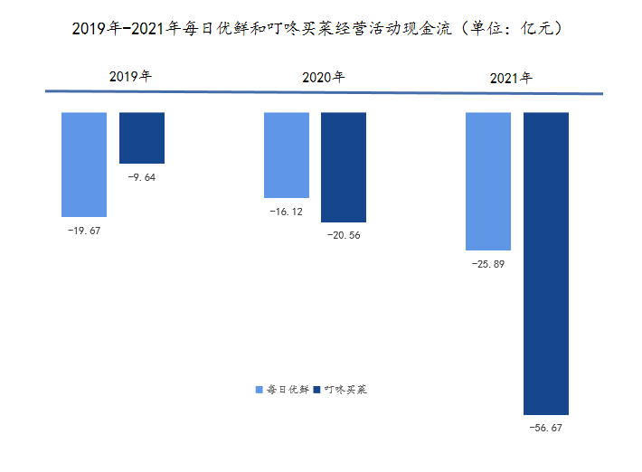 因为对于同样走前置仓模式的每日优鲜和叮咚买菜来说,二者均面临着长期亏损、现金流不足、资不抵账的问题。