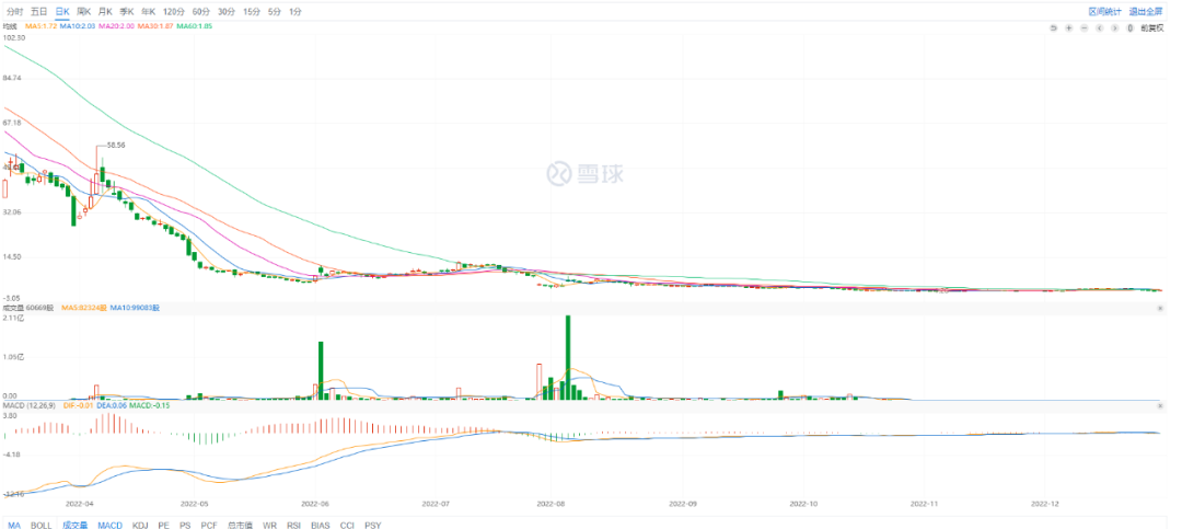 2021年7月,随着每日优鲜先后被曝大量裁员、站点关停、拖欠大量供应商货款,曾经市值高达200亿元的公司,其股价也从最高点时期的58.56美元/股,跌落到1.78美元/股(2022年12月30日收盘)。