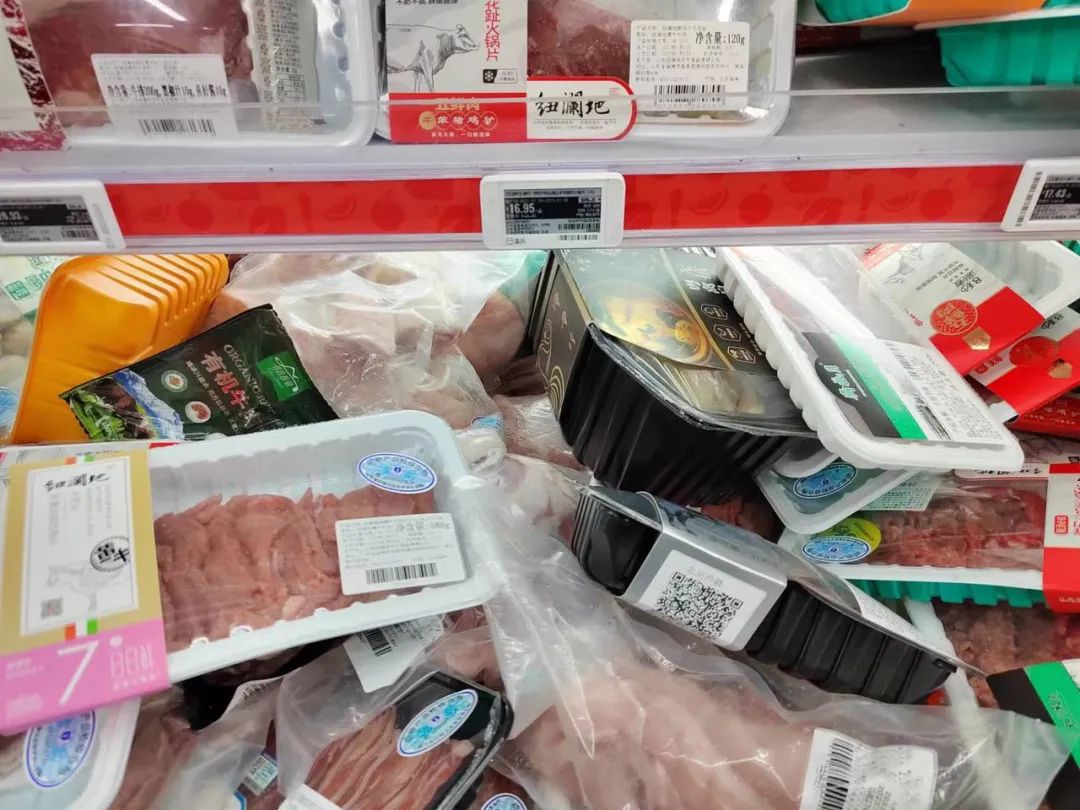 我们站在一旁,略显生疏地使用扫码工具对准一盒排骨,16.95元,6折左右。老太太也凑过来看手机屏幕上的结果,而后似乎是彻底对猪肉失望了,推着灰色的小推车,转身去了卖牛肉和鸡肉的冷藏柜。