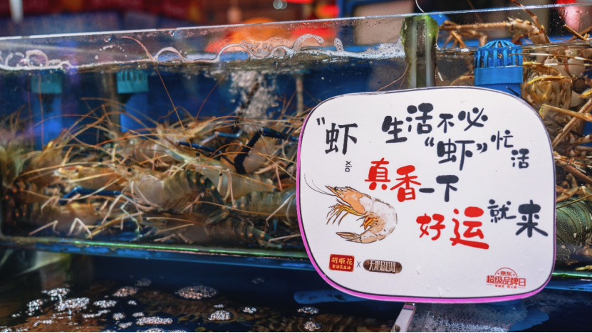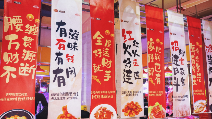 例如印有苦瓜的吊幅,写有“人生‘苦’短,真香胡姬花,美味再来一碗”。每一句“开运”文学,都精准洞察到当代人的情绪痛点,能够引发情绪共鸣,同时又将品牌特色融入开运祝福中,向大众传递出独属于胡姬花自身的温度和理念。