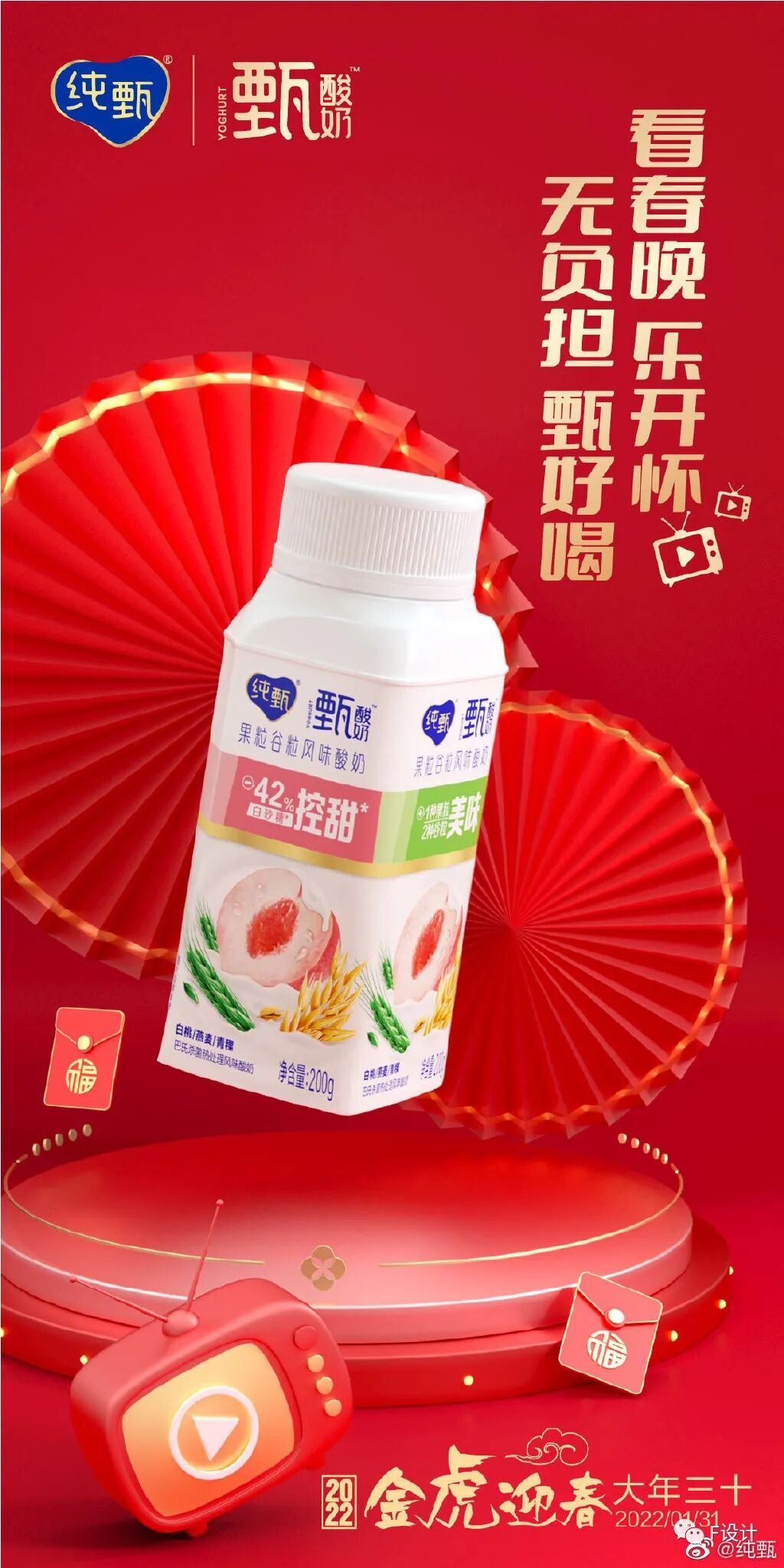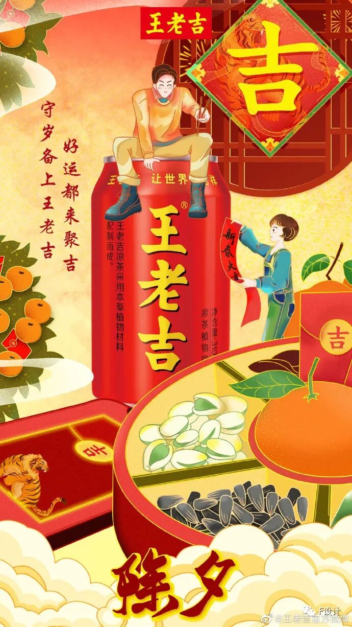 #除夕#来到,张灯结彩除旧岁,红红火火的王老吉也安排起来,今晚的通宵守岁,祝大家吉运到,手气佳!年味,是集市上的喧嚣、街头挂满的大红灯笼,也是隔着屏幕仍要传递的问候、相距千里也不忘的团圆相思。除夕了,无论在哪儿,小伊都会陪你一起过年。只要心怀热爱,所有的爱都将跨越山海,来到你身边!除夕到,阖家欢!吃完年夜饭,和家人一起守着电视看春晚!拿出-42%白砂糖,+3.2g膳食纤维的新一代健康甄酸奶和家人一起边看边喝,欢欢喜喜迎虎年!辞旧岁,迎新春