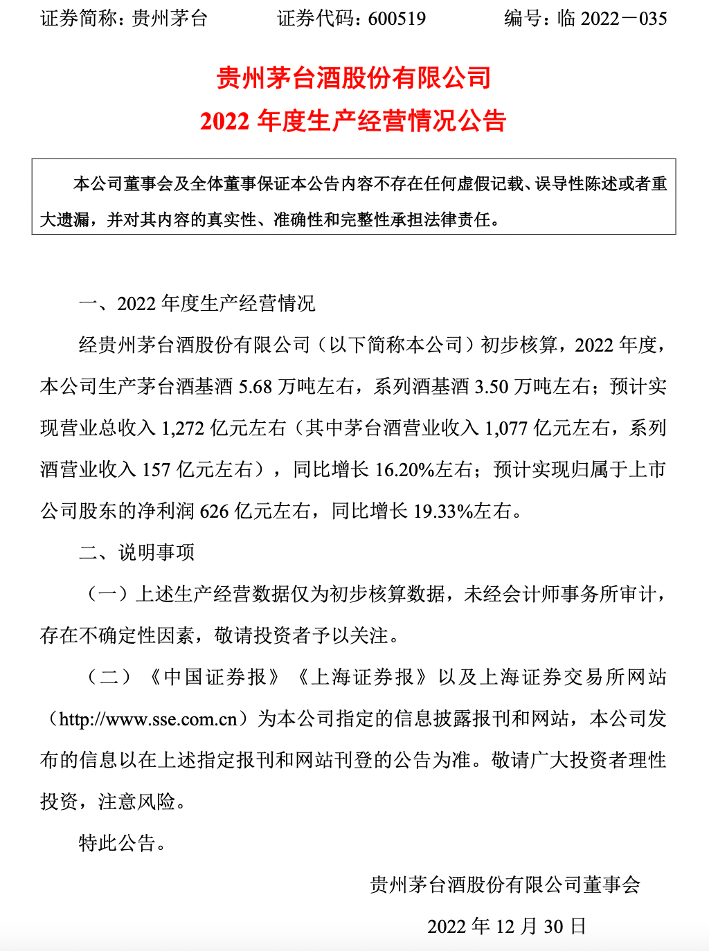 就在最近,茅台公布了2022年的生产经营情况:预计实现营业收入1272亿,同比增长16.2%;净利润626亿,同比增长近20%。