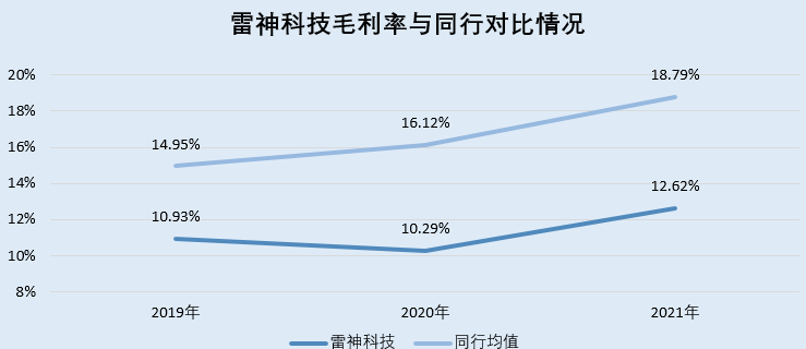 而雷神科技的产品以电竞硬件设备为主,只能在固有成本上浮一定比例进行销售,由此导致雷神科技盈利能力始终受限。