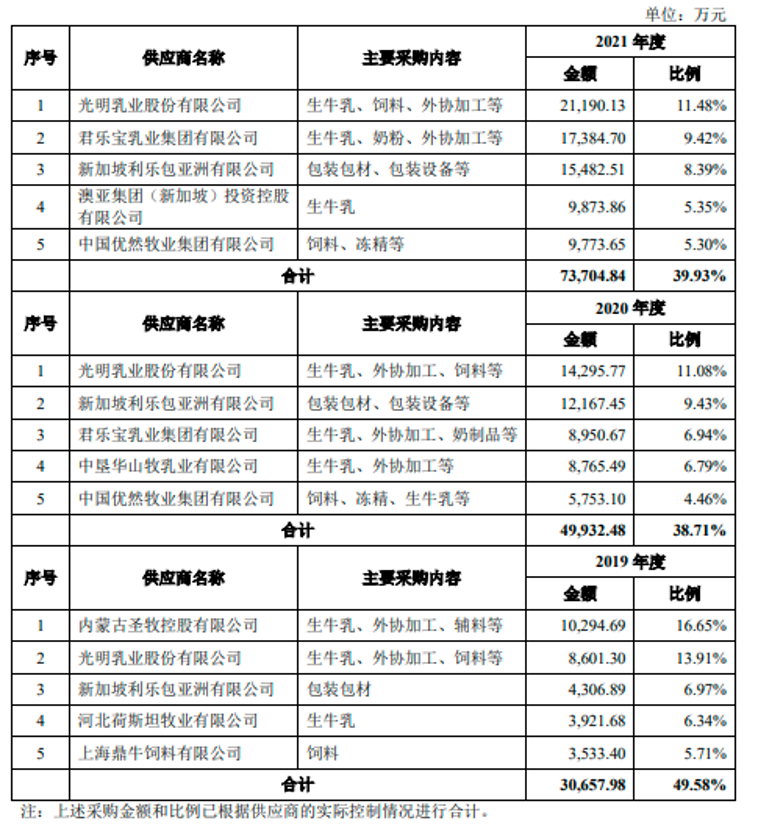 公司的合作奶源供应商包括君乐宝乳业、澳亚牧业、圣牧乳业、光明乳业等企业。公司向供应商采购的内容包括生牛乳、奶粉、外协加工等。其中,2021年向光明、君乐宝、利乐包、澳亚牧业、优然牧业五家企业累计采购了7.4亿元,占比为39.93%。