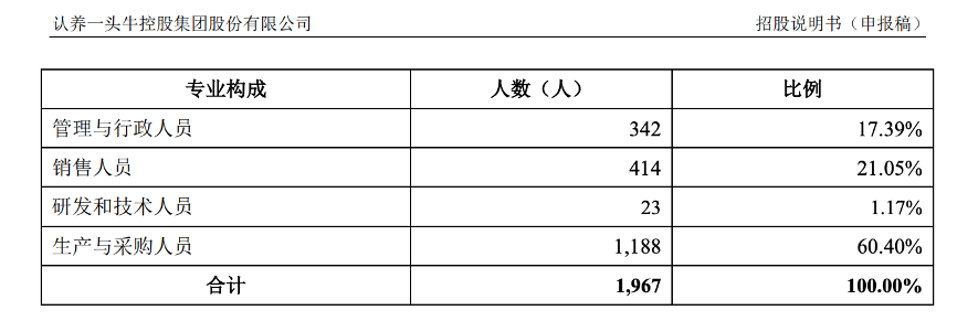 与销售费用形成鲜明对比的是,认养一头牛研发费用少到可怜,甚至研发人员仅为23人。招股书显示,2019年-2021年认养一头闹研发费用从0增长至687万元,研发投入占营收比分别为0%、0.04%、0.27%。