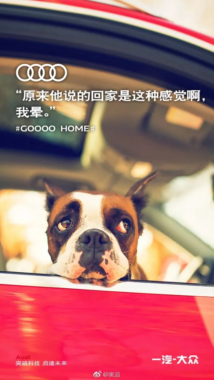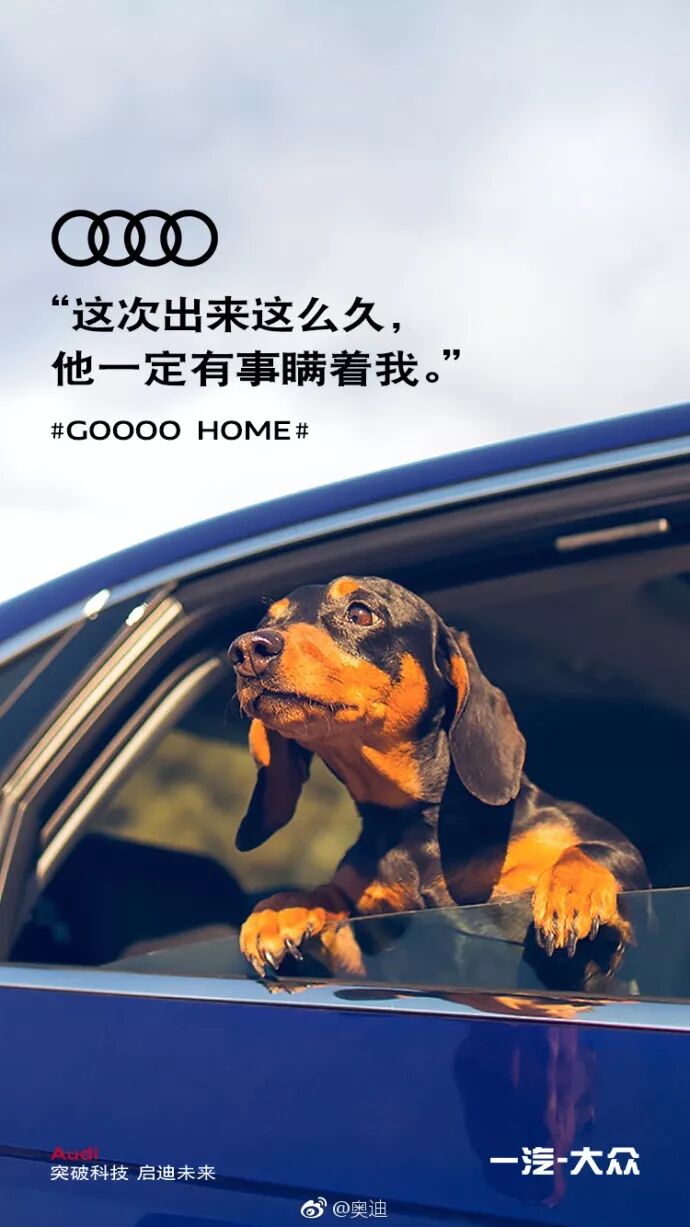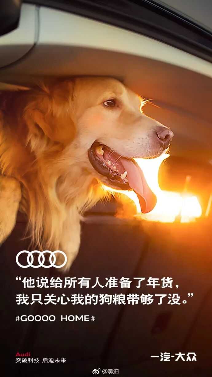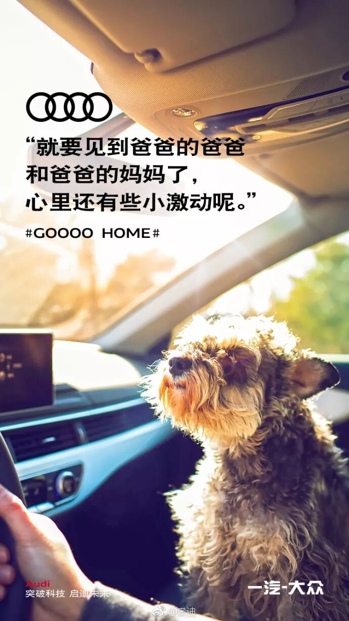 其一,GOOOO的长音表现出了回家的迫切,其二是GOOOO的四个圆圈代表着奥迪的四环,新年要带着奥迪回家。