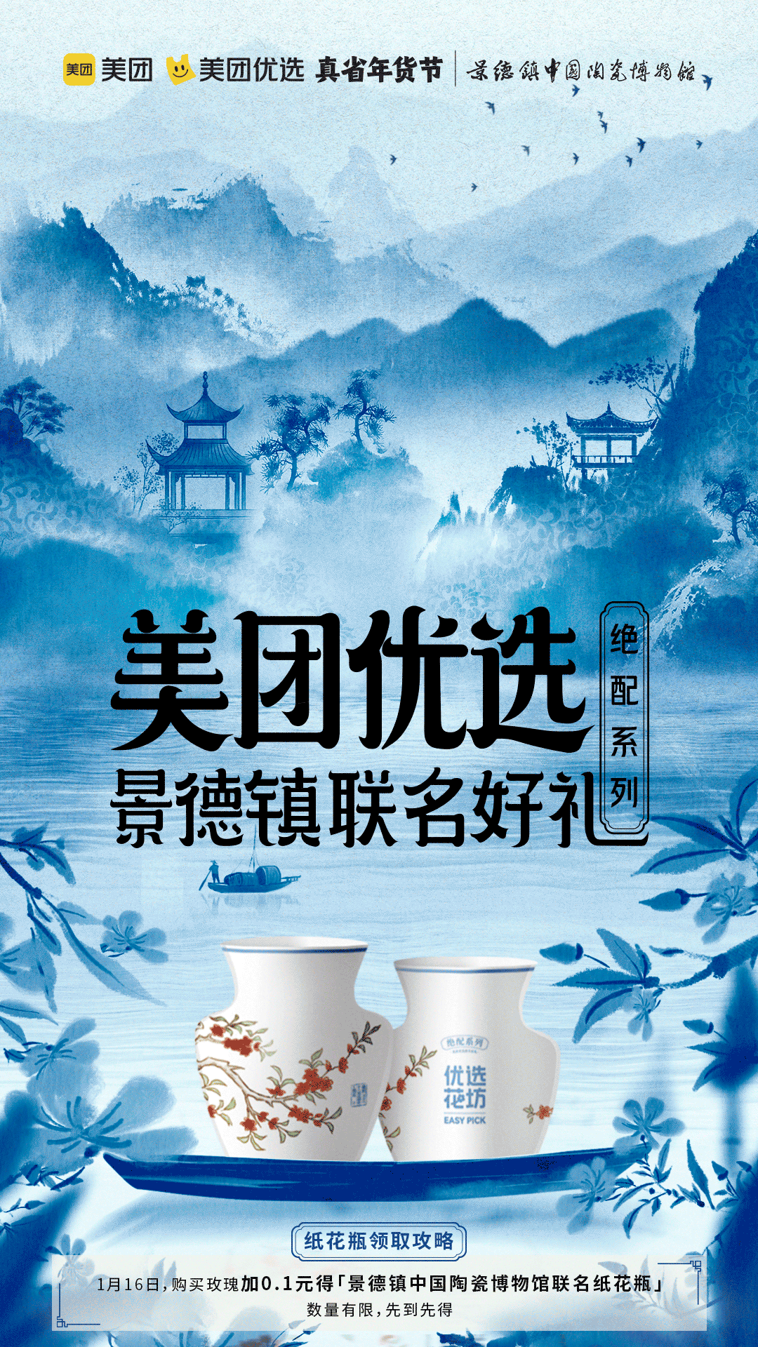 首先,在此次年货节,美团优选抓住春节这个全年花卉绿植品类爆发的最大节点,推出自有商品IP「优选花坊」,并跨界景德镇推出限定周边青花瓷纹样纸花瓶。通过对有百年历史的文化符号的活用,让自身IP与消费者完成了创新互动,可谓真正的“锦上添花”,给品牌注入高质量的文化附加值。