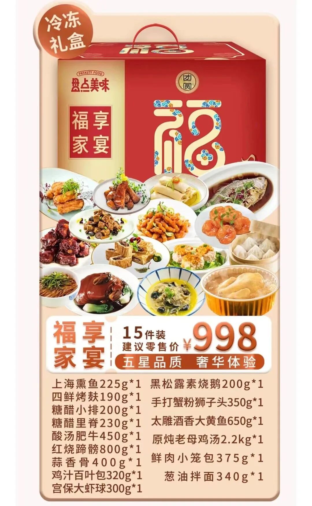 “与去年相比,今年的预制菜产品更讲究性价比,简单实惠的套餐会更受春节市场欢迎。”伍俊峰介绍,盘点美味针对今年春节档推出了多款年夜饭套餐,大部分套餐的单价都在500元以下,而主打的998元年夜饭套餐一共包含15个菜品,既有上海熏鱼、红烧蹄髈、糖醋排骨这类颇受长三角地区居民欢迎的家常热菜,也有冷菜、汤品和点心。