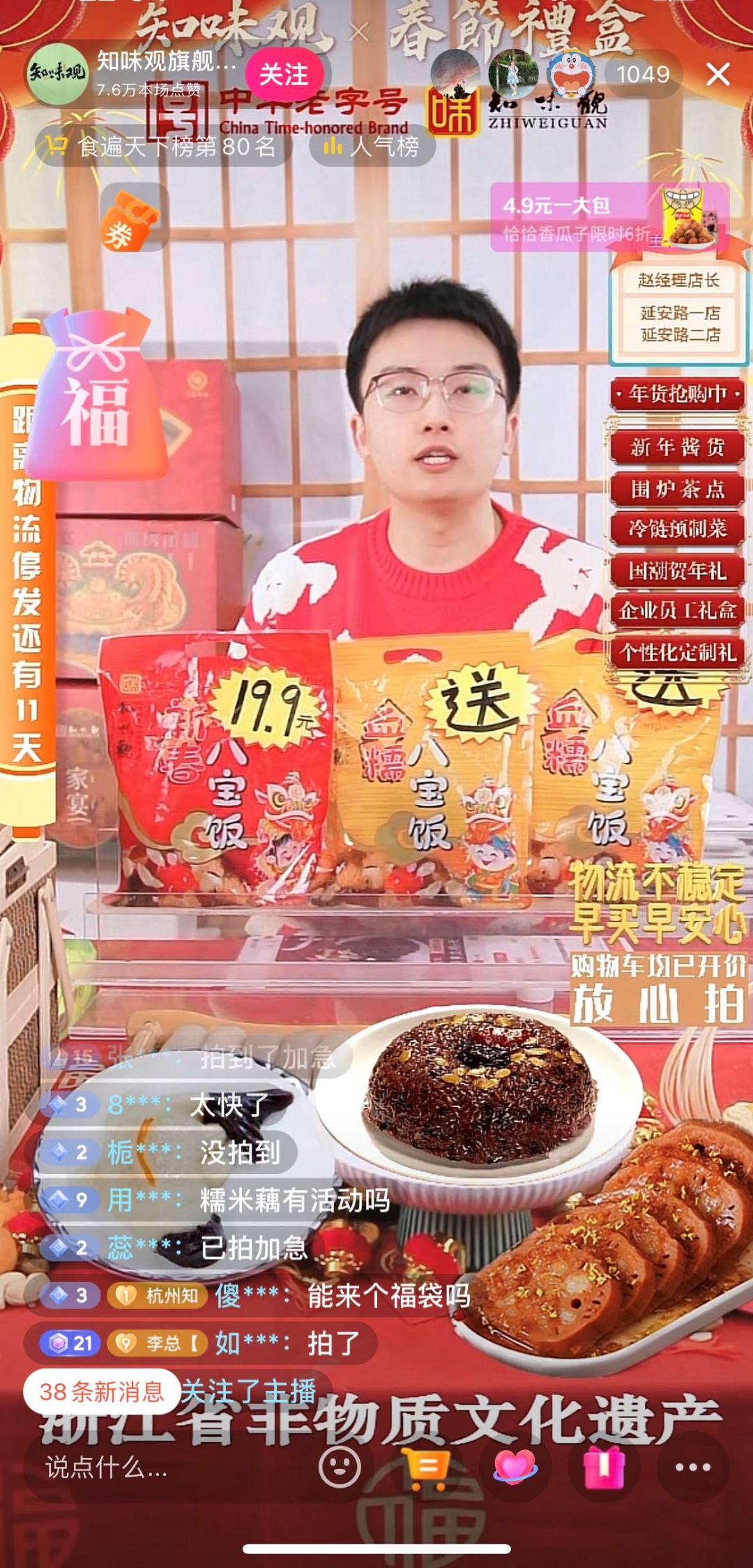 知味观直播间内,则推出“买一赠二”19.9元到手三包300g八宝饭的抢购活动;