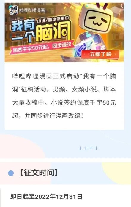 为了增强自身打造IP的能力,降低对于海外漫画作品的依赖,哔哩哔哩漫画也曾采取了一些为平台培养创作者的策略,比如2022年上半年,哔哩哔哩漫画就推出过持续到年末的小说/脚本征集活动,征稿范围包括男性向和女性向多个题材,并表示将同步对作品进行漫画改编。