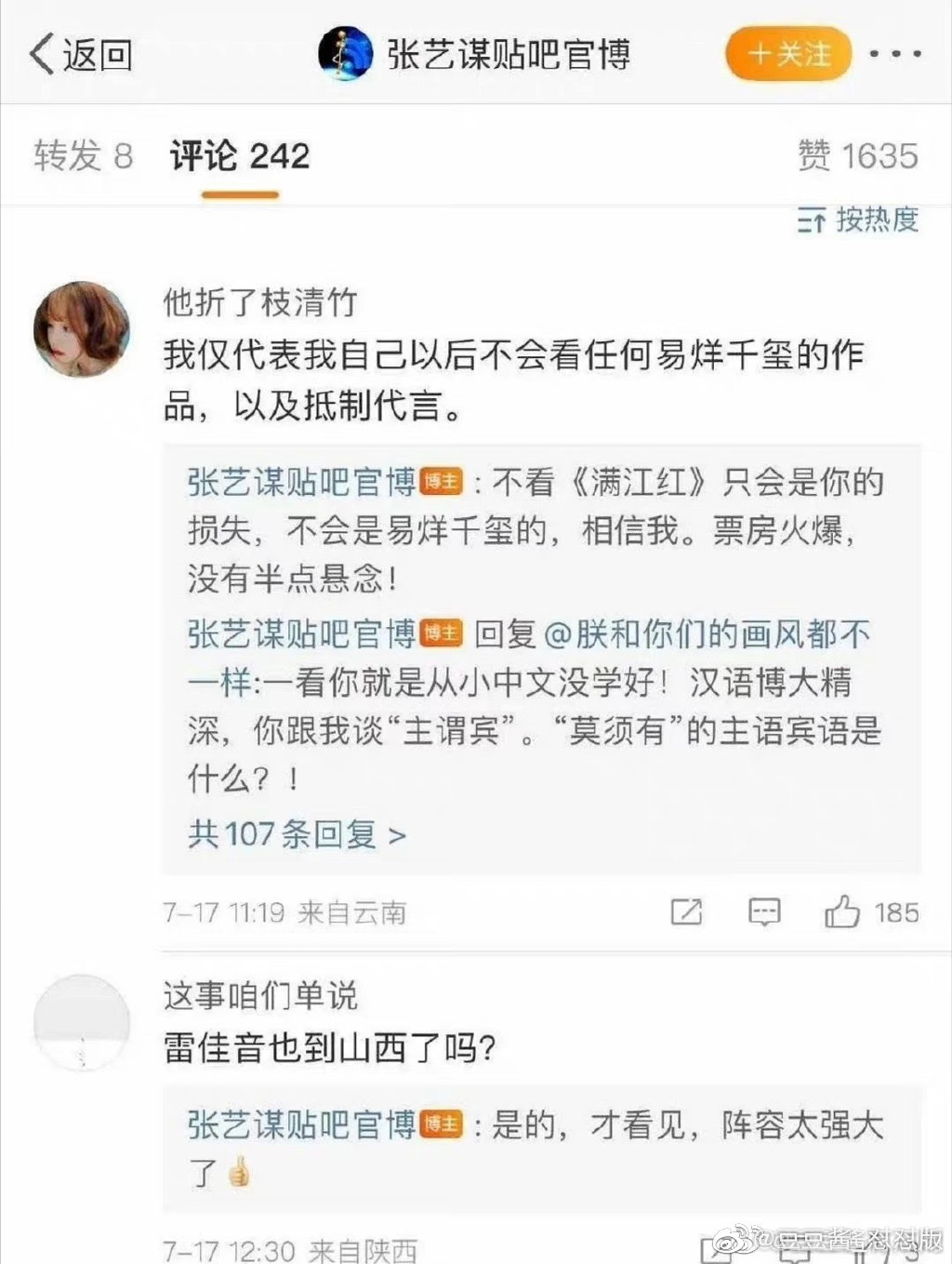 张艺谋官微贴吧则说:不看《满江红》是你的损失。